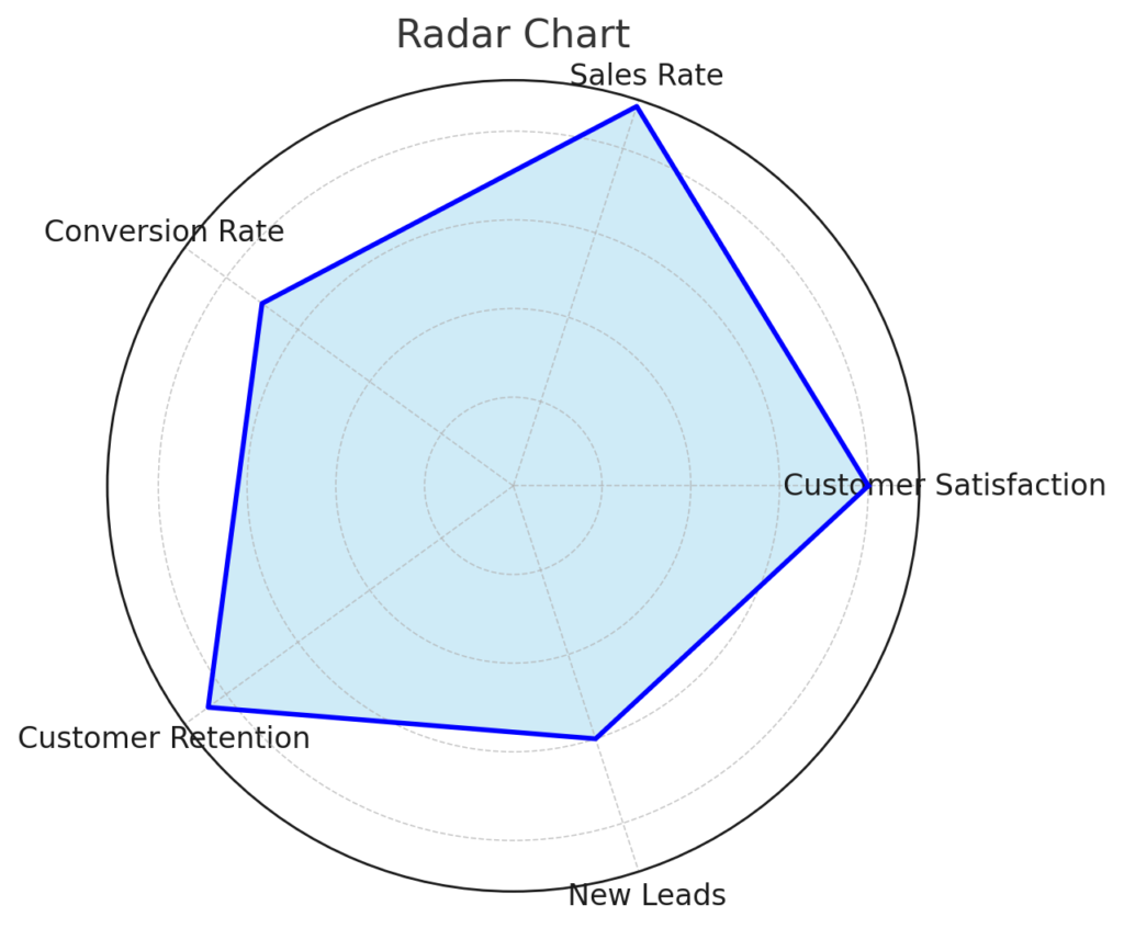 例えば、営業部門のパフォーマンスを「顧客満足度」「売上達成率」「成約率」「新規顧客獲得数」などの項目でレーダーチャートにまとめると、どの項目が優れているか、どこが改善が必要かを一目で確認できます。これをもとに目標達成に向けた計画を具体化することができます。