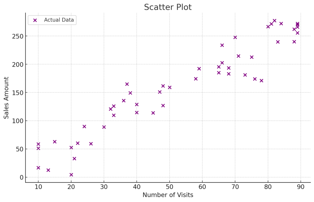 散布図は、2つの変数間の関係を視覚的に表現するグラフです。横軸と縦軸に異なる変数を配置し、それぞれの点の位置で変数同士の関連性や分布の傾向を把握できます。特に、どの要因が成果に影響を与えているのかを分析する場合に有効です。