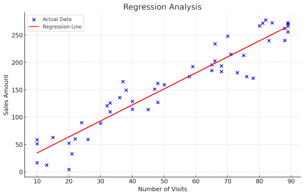 営業部門の売上予測をする際に、訪問件数や電話対応回数など複数の変数を基に売上の増減を予測するモデルを作成します。回帰分析の結果から、最も影響力の大きい要因が明確になり、どこにリソースを集中するべきかが判断しやすくなります。